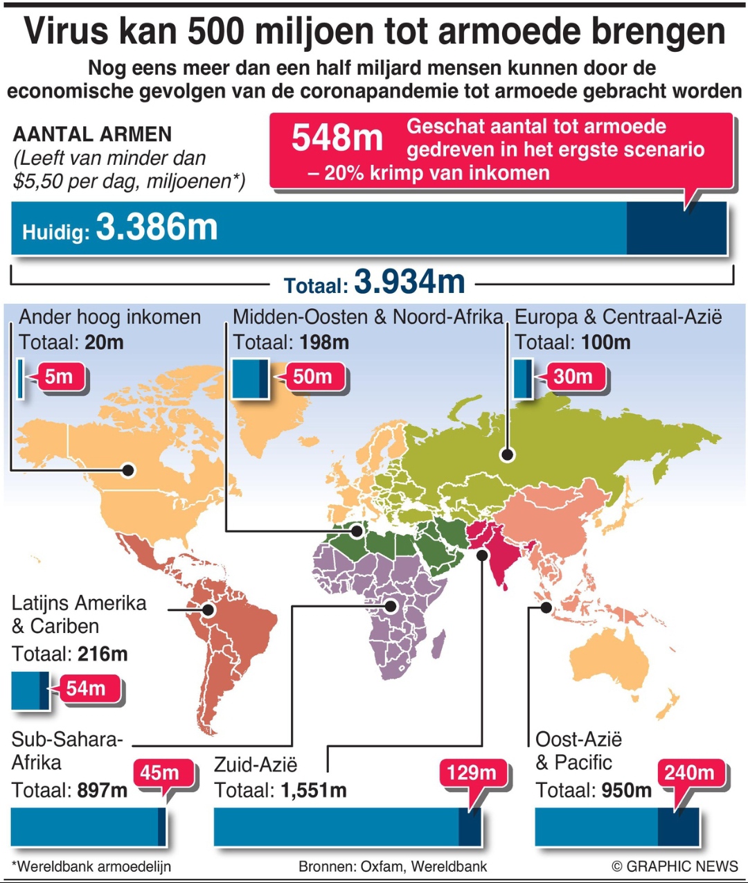 Nog eens meer dan een half miljard mensen kunnen door de economische gevolgen van de coronapandemie tot armoede gebracht worden.