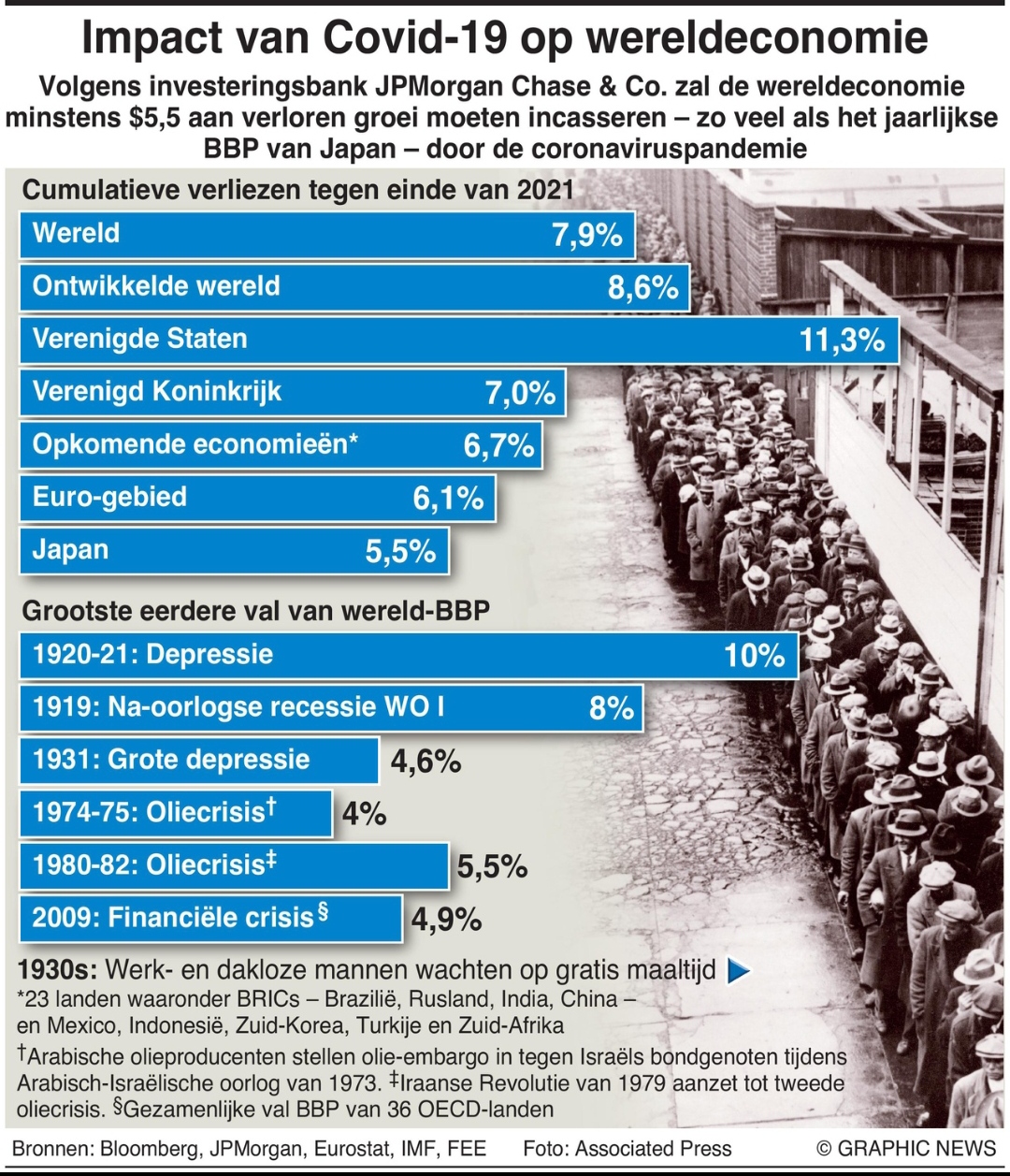 De economen van JPMorgan zetten de verloren wereldoutput op 5,5 biljoen dollar of 7,9 procent van het BBP tegen het einde van 2021. Deze klap is vergelijkbaar met het volledige bruto binnenlands product van Japan — de derde grootste economie van de wereld — met zijn nominaal BBP van $5.15 triljoen.