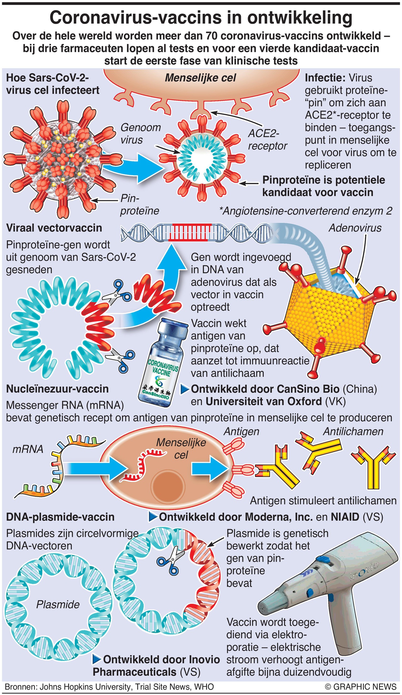 Over de hele wereld worden meer dan 70 coronavirus-vaccins ontwikkeld – bij drie farmaceuten lopen al tests en voor een vierde kandidaat-vaccin start de eerste fase van klinische tests.