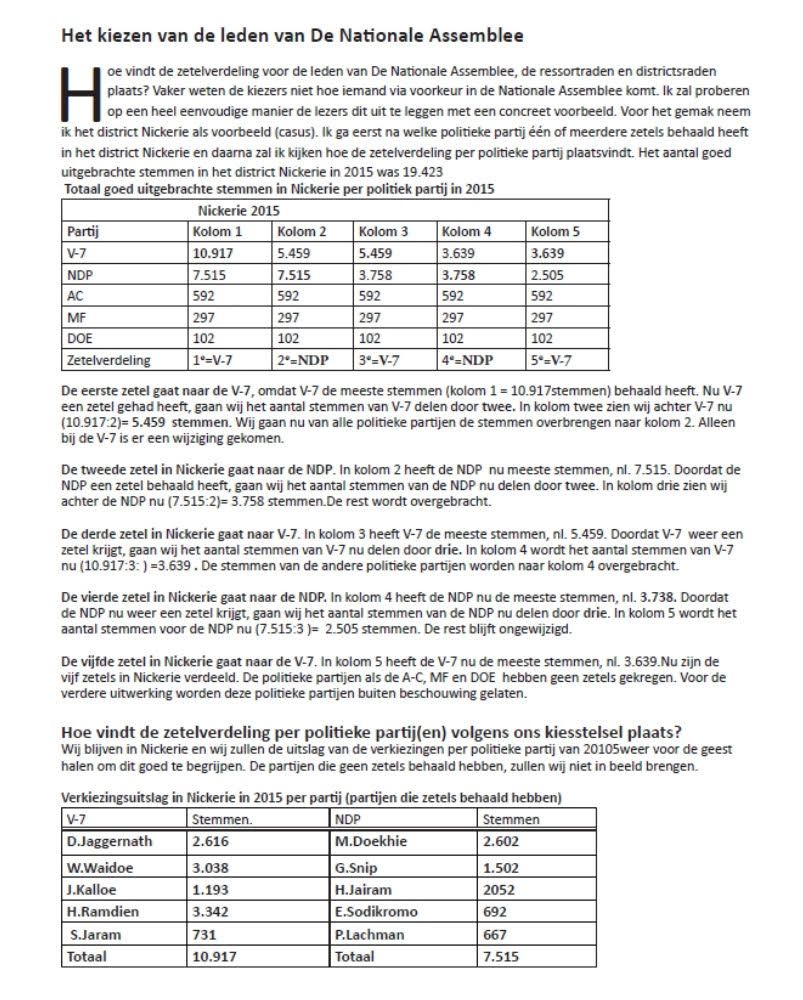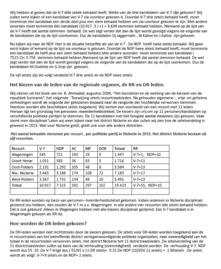 In het boekwerk ” De verkiezingsresultaten van 25 mei 2015 en een terugblik” geeft auteur Ramadin op de ondergeplaatste pagina’s aan hoe zetels behaald worden bij de verkiezingen; hier is uiteengezet hoe de leden van DNA, RR en DR leden verkozen worden: