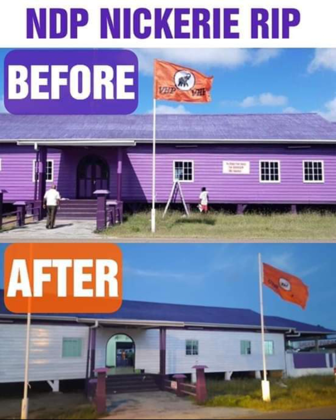Het oud partijgebouw van de NDP, eigendom van Rashied Doekhie, is met de plaatsing van de VHP vlag en het wit overschilderen van het gebouw blijkbaar officieel omgetoverd tot VHP partijgebouw.