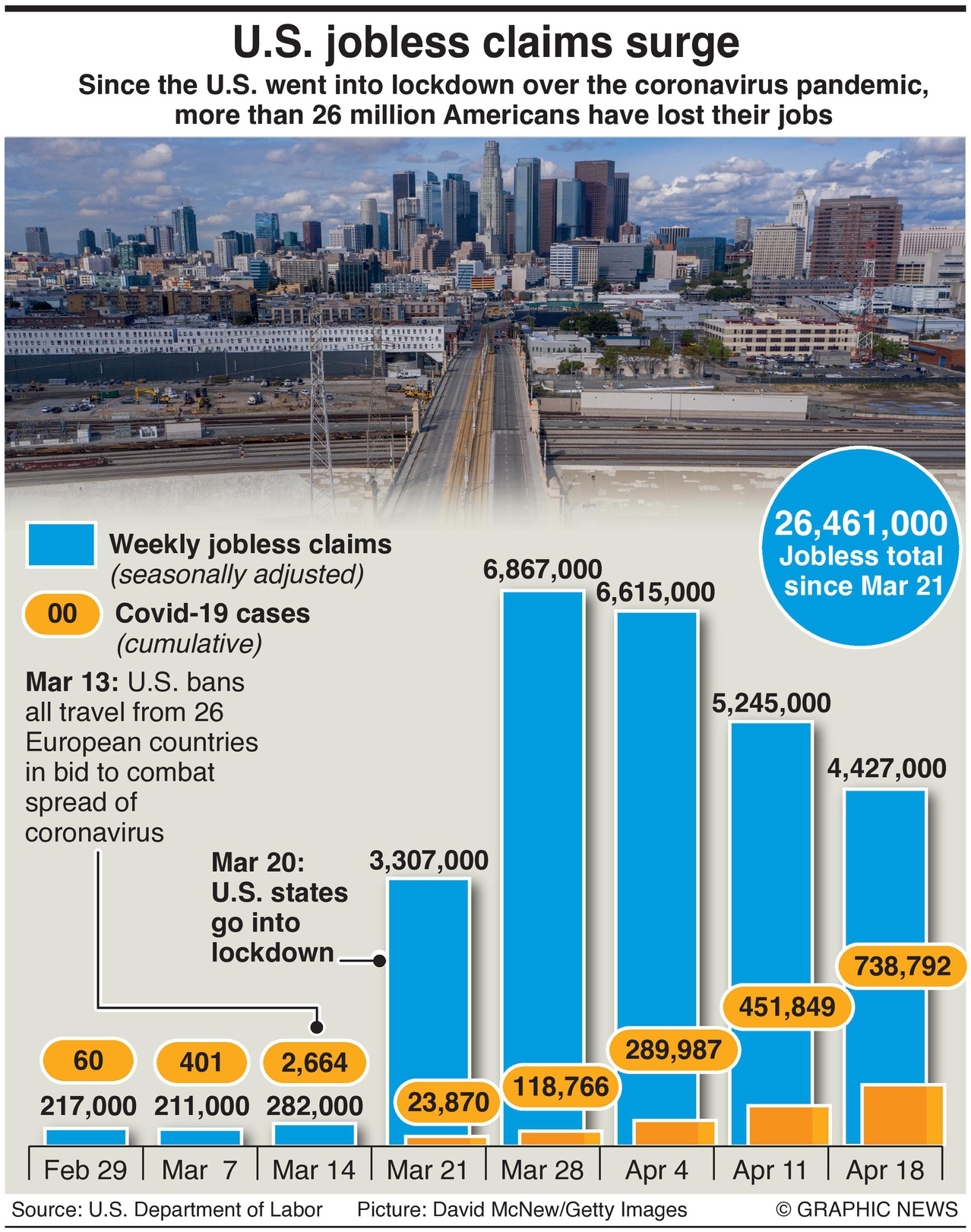 Slechts twee maanden geleden, waren de nieuwe claims onder de 300.000 per week. Echter, de recordpiek in plotseling werkloze Amerikanen groeide met nog eens 4,43 miljoen in de week tot 18 april. Deze toename bracht het totaal op 26.461.000 sinds de coronavirus pandemie grote delen van de Amerikaanse economie op 20 maart afsloot.