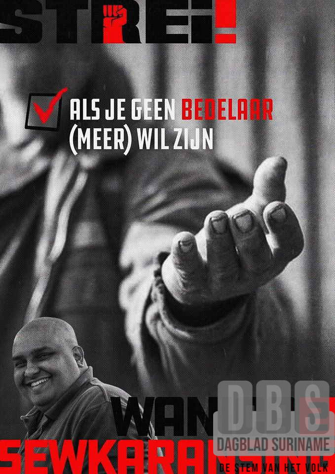 Sinds zijn kandidaatstelling in Wanica is dezelfde vriend van hem een stapje verder gegaan door posters met heel opmerkelijke uitspraken te publiceren. Met teksten als ‘Als je wilt dat Diamond betaalbaar wordt’, ‘Om nog een side chick te kunnen permitteren’ en ‘als je geen bedelaar (meer) wilt zijn’ groeit de populariteit van Sewkaransing nog verder op vooral Facebook. “Het gaat erom om mensen aan het denken te zetten. Het heeft te maken met de economie, de onderliggende boodschap. Omdat hij het zo heeft gebracht, trekt de aandacht, omdat niemand zich zo profileert. Ik ben de enige die zaken op een andere manier brengt, omdat het zaken zijn die in de gemeenschap spelen. ’s Avonds wil je een beetje uitgaan, je wilt vertier en je hersenen een beetje tot rust brengen. Dat heeft ook met de economie te maken. Heel veel mensen hebben mij erover benaderd.” De politicus stelt dat haast alle kandidaten campagne voeren onder de termen ‘vooruitgang’ en ‘aardappel en uien’, maar op zo een manier iets naar voren brengen, middels een meme, werkt volgens hem beter. Hij staat compleet achter deze boodschap.