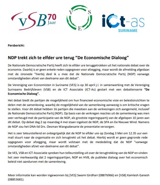 In een vandaag uitgegeven persbericht doen de VES, de VSB en de ICT-Associatie er melding van dat de NDP zich zich te elfder ure terugtrekt uit de politieke debatten “De Economische Dialoog”.