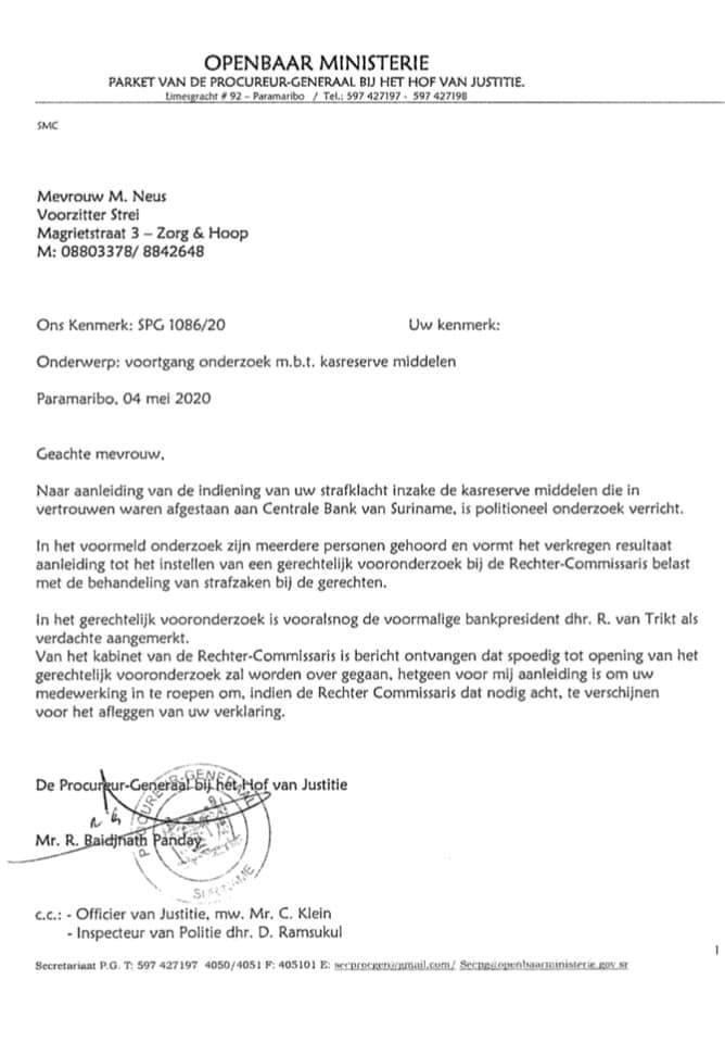 Maisha Neus, voorzitter van STREI! en een der indieners van een strafklacht inzake onrechtmatig door de Centrale Bank van Suriname (CBvS) aangewende vreemde valuta-kasreserve van de handelsbanken, is middels een schrijven van de Procureur in kennis gesteld dat er politioneel onderzoek verricht is in deze kwestie. Ook wordt gesteld in dit schrijven dat meerdere personen terzake gehoord zijn, waarbij intussen de ex-bankdirecteur R. van Trikt als verdachte is aangemerkt, en dat dit alles geresulteerd heeft in het op kort termijn instellen van een gerechtelijk vooronderzoek (GVO).