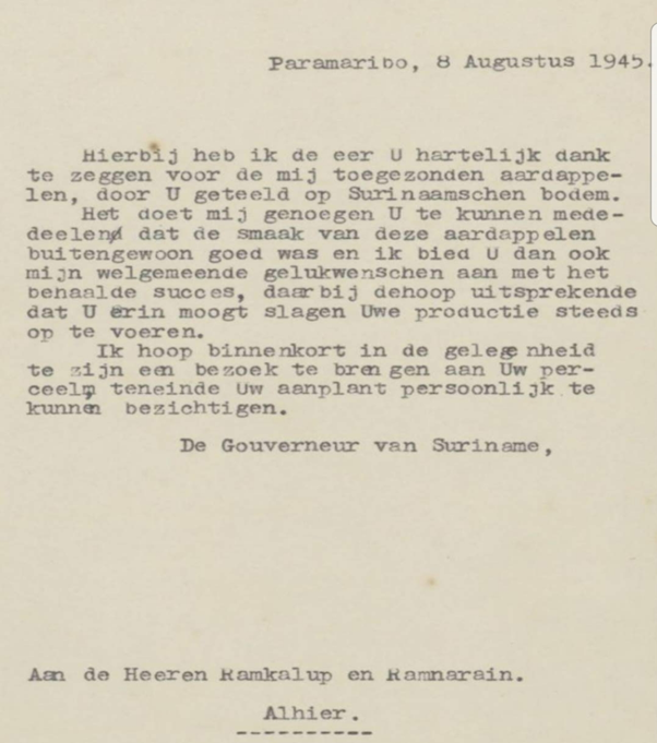 In 2012 heb ik in het Nationaal Archief een mooie brief gevonden. De brief is geschreven door de toenmalige gouverneur van Suriname, gestempeld door koningin Wilhelmina, om de heren Ramkalup en Ramnarain te danken voor het zenden van Surinaamse aardappelen naar Nederland gedurende de hongerwinter ’44-’45. Mijn overgrootvader Ramkalup heeft Nederland voedselpakketten gestuurd tijdens de Tweede Wereldoorlog. Veel Surinamers staken hun handen uit de mouwen en hielpen de Nederlanders met de wederopbouw gedurende ’45-’50.