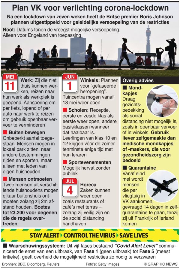 Na een lockdown van zeven weken heeft de Britse premier Boris Johnson zijn voorlopige plannen uitgestippeld voor geleidelijke versoepeling van de restricties.