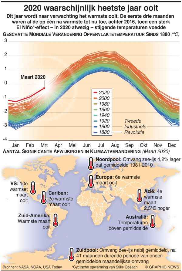 Dit jaar wordt naar verwachting het warmste ooit. De eerste drie maanden waren al de op één na warmste tot nu toe. Wetenschappers van de National Oceanic and Atmospheric Administration (NOAA) geloven dat 2020 een 75% kans heeft om het warmste jaar te zijn voor de planeet Aarde.