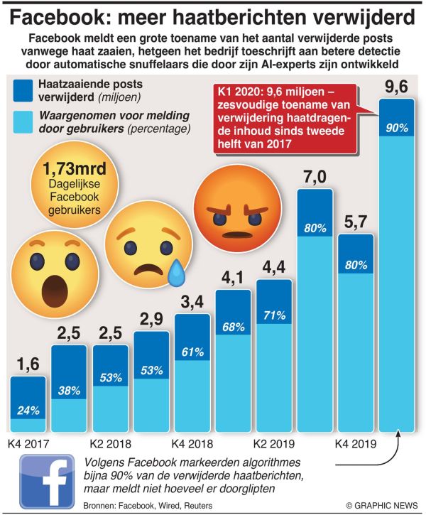 Het grootste social-mediabedrijf ter wereld heeft in het eerste kwartaal ongeveer 9,6 miljoen berichten met haatzaaiende toespraken op zijn vlaggenschip-app verwijderd, tegen 5,7 miljoen in het vierde kwartaal van 2019.