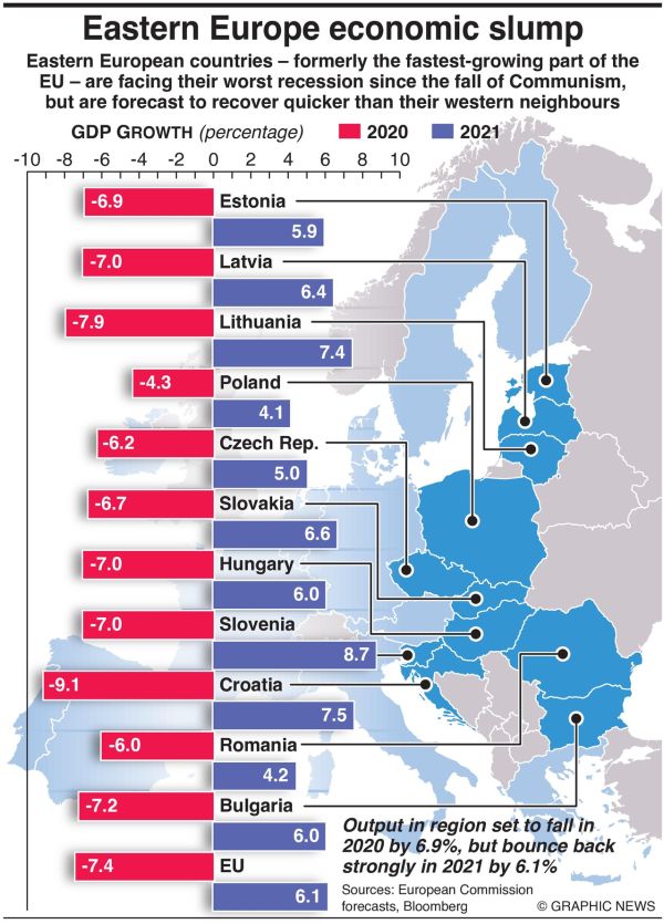 De economieën van de Oost-Europese landen – Bulgarije, Roemenië, Kroatië, Hongarije, Slovenië, Slowakije, Tsjechië, Polen, Litouwen, Letland en Estland – zullen dit jaar collectief met 6,9 procent krimpen, voorspelt de Europese Commissie.