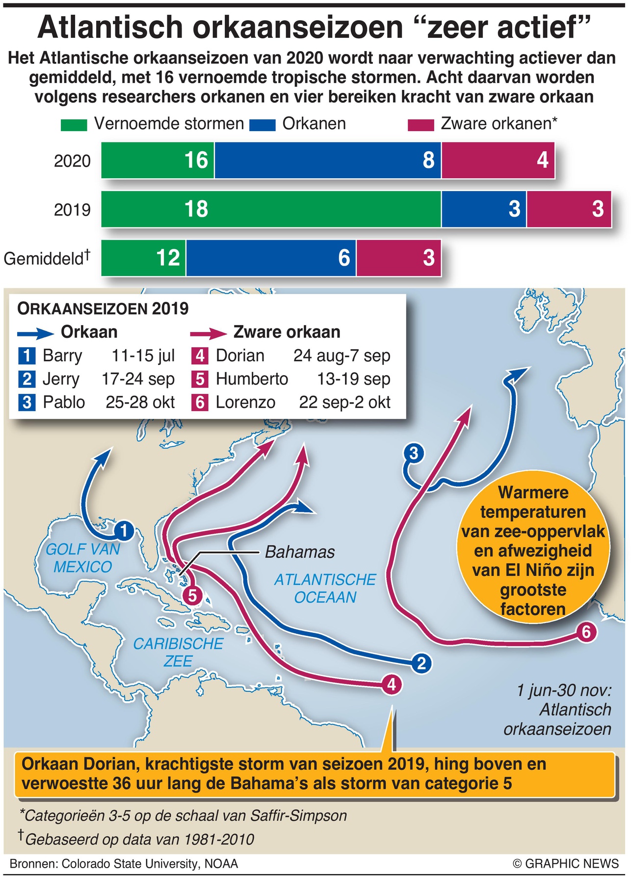 HET ATLANTISCHE ORKAANSEIZOEN VAN 2020 WORDT NAAR VERWACHTING ACTIEVER DAN GEMIDDELD, MET 16 VERNOEMDE TROPISCHE STORMEN. ACHT DAARVAN WORDEN VOLGENS ONDERZOEKERS ORKANEN EN VIER BEREIKEN KRACHT VAN ZWARE ORKAAN.