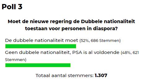 Ook weer zo een vraag waar de meningen best rechtvaardig over verdeeld zijn, is de vraag of de nieuwe regering de Dubbele nationaliteit moet toestaan voor personen in de diaspora.