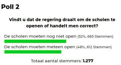 Uw opinie zou anders kunnen zijn geweest, maar in dit specifieke geval waren de meningen “eerlijk” verdeeld: de helft van onze lezers die hun stem uitbrachten op deze peiling, althans: 52% of 665 stemmen van de 1277 uitgebrachte stemmen, vindt dat de scholen nog niet open moeten, maar de andere helft, eigenlijk 48% of 612 personen, vindt dat de scholen meteen open moeten. Krap verschil. Dus: toch nog maar een nachtje over slapen, dan?