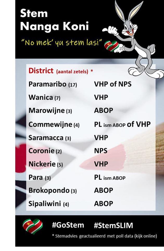 “De totale Surinaamse samenleving heeft er belang bij dat het beleid van de afgelopen jaren niet gecontinueerd wordt. Als we in een land willen wonen waar we zelf in vrijheid onze spulletjes kunnen kopen in de winkel, als we in een land willen wonen met rechtszekerheid, als we in een land willen wonen waar medicatie voorhanden is en we goede scholing kunnen genieten, dan is het belangrijk dat we maandag gaan stemmen. Massaal en vooral slim!“.