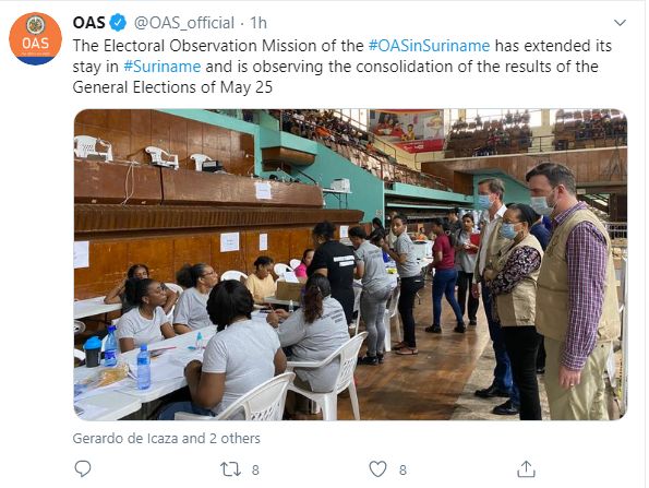 De Verkiezings Observatie Missie van de OAS heeft haar verblijf in Suriname verlengd en observeert de consolidatie van de resultaten van de algemene verkiezingen van 25 mei 2020.