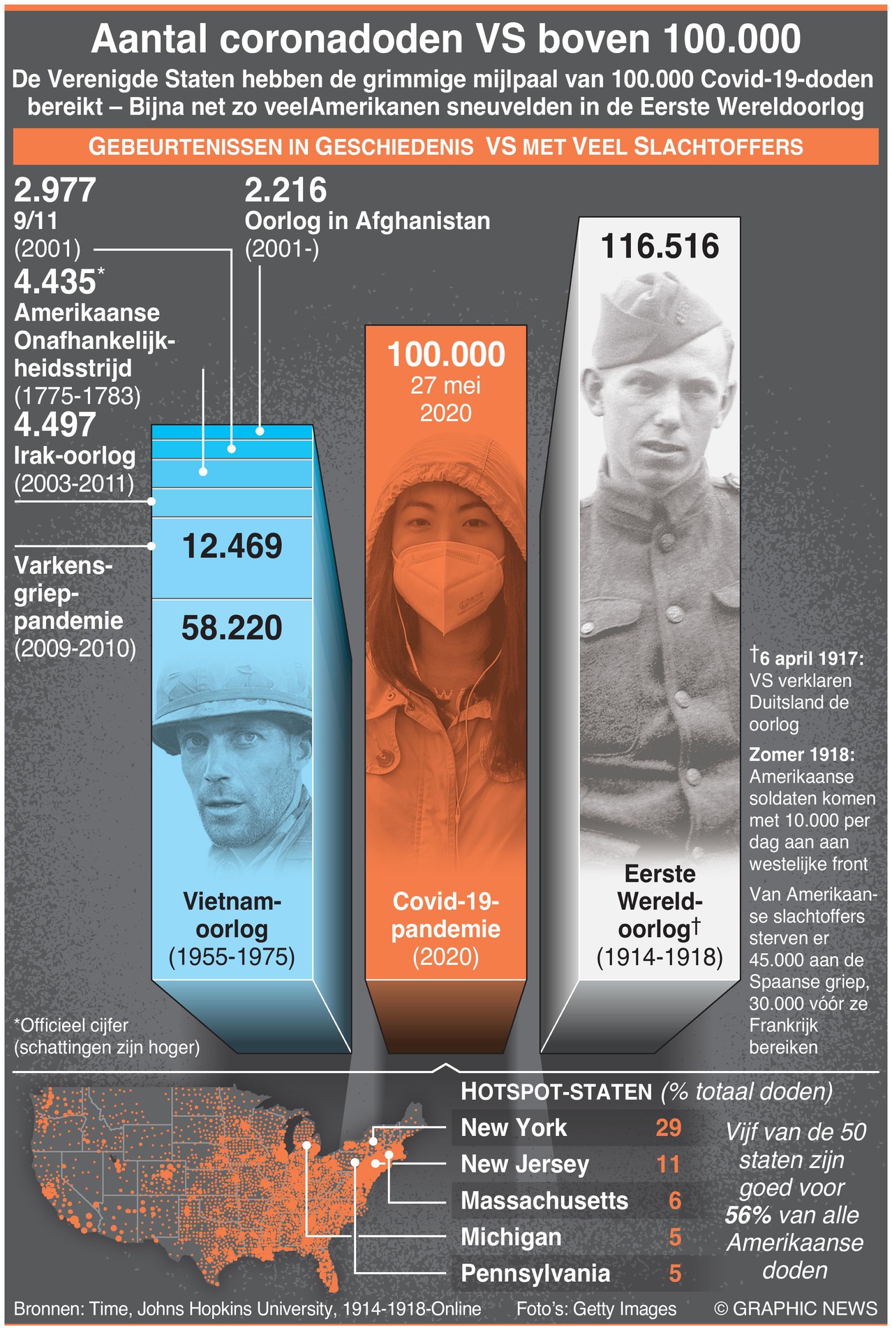 De Verenigde Staten hebben de grimmige mijlpaal van 100.000 Covid-19-doden bereikt – Bijna net zo veelAmerikanen sneuvelden in de Eerste Wereldoorlog.