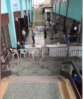 In de Anthony Nesty Sporthal zijn vanmorgen de mensen van het Hoofdstembureau kennelijk gereed om het werk te hervatten. Ook de waarnemers, zelfs van de OAS zijn aanwezig, en naar verluidt is het wachten op de mensen van het OKB.