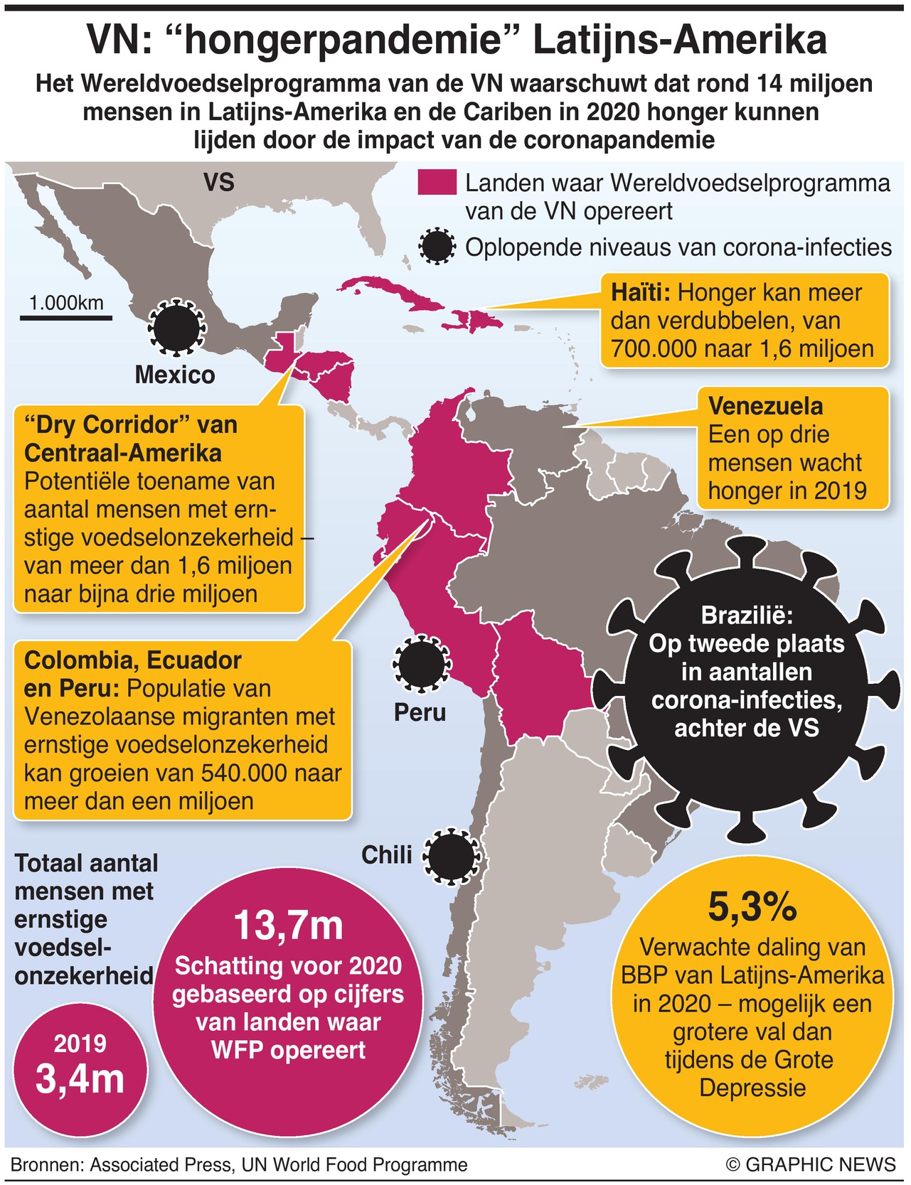 Het aantal mensen dat honger lijdt zal waarschijnlijk hoger zijn dan de VN-prognose, die alleen rekening houdt met de cijfers in de 11 landen waar de organisatie actief is. De schatting houdt bijvoorbeeld geen rekening met Venezuela, waar een op de drie mensen vorig jaar honger leed, volgens de studie van het voedselagentschap van 2019.