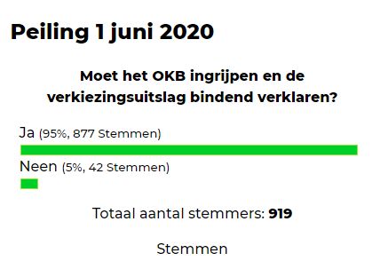 Van de 919 stemmers vond 95%, 877 personen dus, dat het OKB inderdaad moet ingrijpen en de uitslag bindend verklaren, terwijl slechts 5% of 42 stemmers het daar niet mee eens waren.