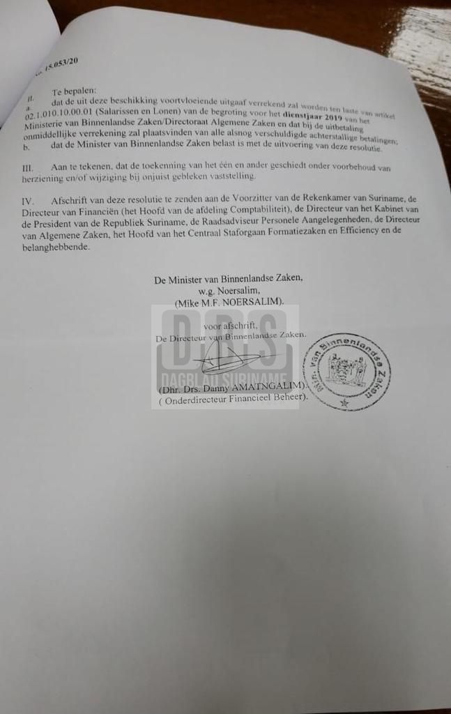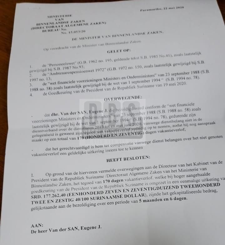 Het is besluit is genomen op 22 mei 2020 om Van der San over deze periode het salaris uit te betalen en vertegenwoordigd dit het bedrag groot SRD 177.262,40.