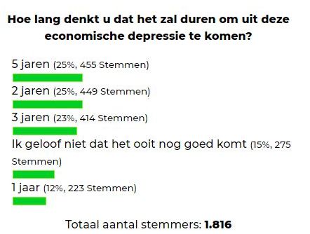 Er deden maar liefst 1.816 respondenten mee, en daarvan gelooft een kwart (25%, 455 personen) dat het binnen 5 jaren goed komt, ook een kwart (25%, 449 stemmen) denkt dat we er binnen 2 jaren uit komen, een iets mindere 23% (414 lezers) denkt dat het zeker 3 jaren zal duren, en er is 12% van al die lezers, 223 personen, die denkt dat we er binnen een jaar uit zullen zijn.