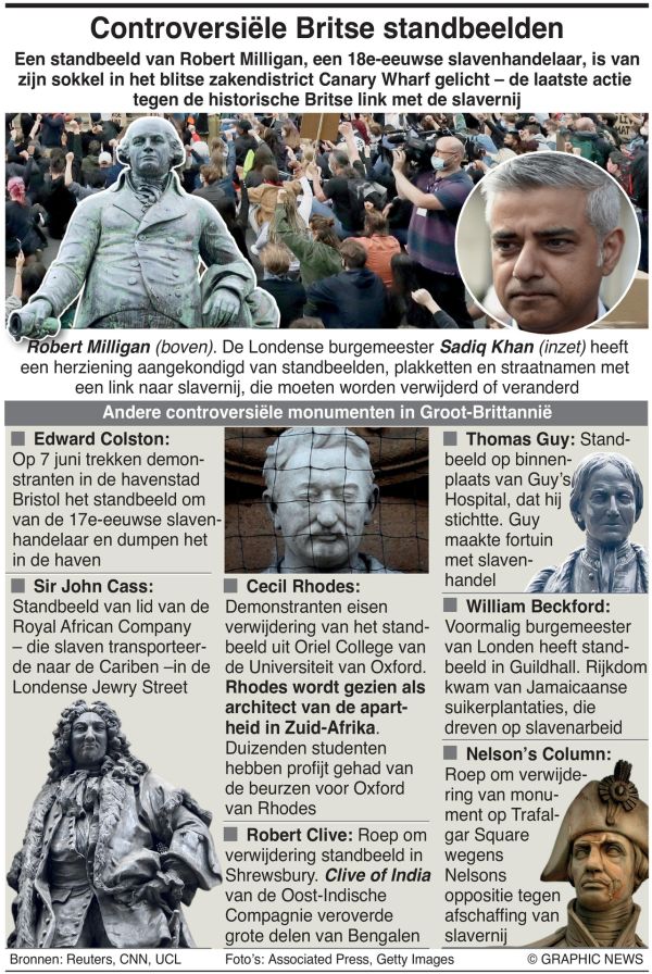 Een standbeeld van Robert Milligan, een 18e-eeuwse slavenhandelaar, is van zijn sokkel in het blitse zakendistrict Canary Wharf gelicht – de laatste actie tegen de historische Britse link met de slavernij.