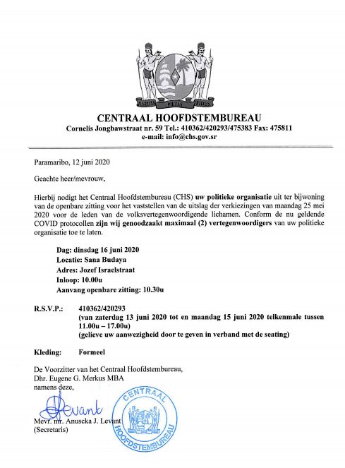 Op dinsdag 16 juni zal in een openbare zitting van het Centraal Hoofdstembureau de uitslag der verkiezingen worden vastgesteld om 10:00 uur in Sana Budaya aan de Jozef Israelstraat.
