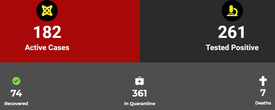 Er zijn nu 74 genezen verklaarde personen, wat eerst nog op 48 stond, dus weer 26 personen die ontslagen en genezen zijn. Dat brengt het aantal actieve gevallen nu op 182, en positieve op 261. 361 personen zijn in quarantaine.
