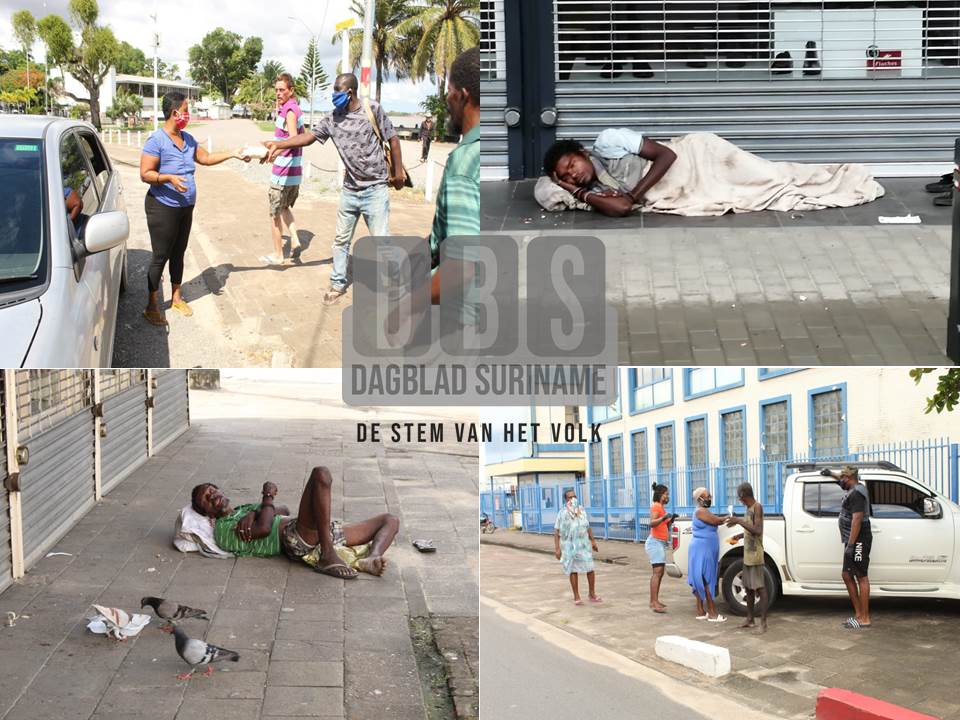 Deze dak- en thuislozen werden gisteren verrast met een broodje. Later op de dag mochten zij ook genieten van een warme maaltijd en een ijsje. De groep dak- en thuislozen heeft het ook moeilijk tijdens deze Covid-19 total lockdown. Waar andere personen de besmetting met het Covid-19 virus kunnen voorkomen door thuis te blijven, heeft de groep dak- en thuislozen die optie echter. Een deel geniet wel van de total lockdown, waardoor zij nu overal en de hele dag ongehinderd en ongestoord kunnen zitten, liggen en slapen. “Den mang e njang den bere spang”, zegt een voorbijlopende burger.