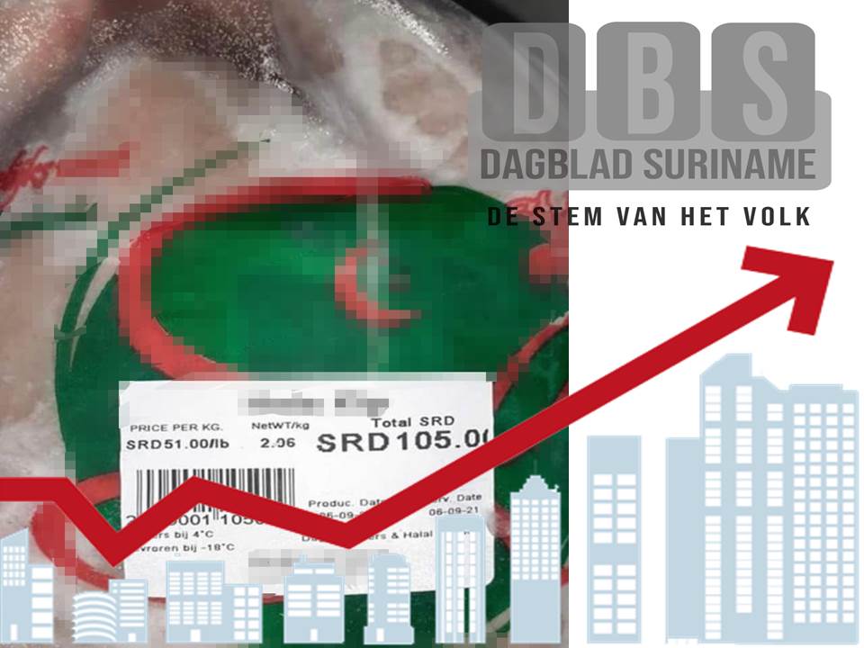 âIk denk twee keren na voordat ik besluit om een panklare hele kip te kopen. Vooral met de prijzen van nu kan ik het mij niet meer permitterenâ, zegt een burger tegen de krant. Het is veel mensen opgevallen dat de prijs van de basisproducten de afgelopen maanden verder zijn gestegen. Daardoor is het heel moeilijk voor bepaalde mensen om door te leven op de wijze hoe zij gewend waren. âVorig jaar kocht ik nog een hele grote kip voor SRD 40, maar in januari werd dat SRD 60 en in maart moest ik meer dan SRD 80 neertellen ervoor. Sinds de community spreading van het Coronavirus en de total lockdown betaal ik nu SRD 135 voor een hele panklare kip. Dat kan toch niet! Waar gaan wij naar toe?â, vraagt de burger zich af. Deze consument voert aan dat hij nog een jaar terug ongeveer SRD 350 per maand betaalde voor 10 hele kippen, maar recent nog voor hetzelfde aantal kippen SRD 870 heeft moeten neertellen. Dat is ongeveer 200% dan een jaar terug. Een kilo panklare kip kost nu ongeveer SRD 51. Niet zo lang terug was dat SRD17,50 per kilo. Nu denkt hij helemaal niet meer aan om in één keer grote inkopen per maand te doen.