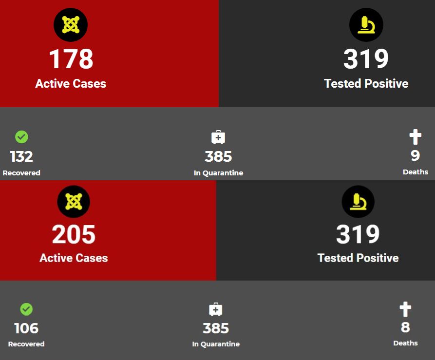 Het aantal genezen personen is weliswaar ook weer toegenomen, en wel van 106 naar 132. Dit betekent dat er dus nog eens 26 personen genezen zijn verklaard. het aantal actieve gevallen komt daarmee te staan op 178; de laatste stand was 205.