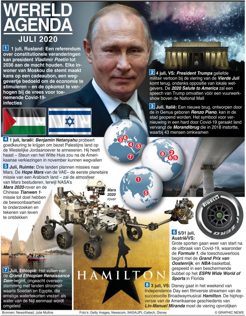1 juli 2020 – 31 juli 2020 – Elke maand publiceert Graphic News een Wereldagenda van de komende gebeurtenissen die de wereld de komende maand vorm zullen geven. De gebeurtenissen in juli omvatten een referendum over constitutionele veranderingen in Rusland waardoor Vladimir Poetin tot 2036 in functie kan blijven; een nieuwe brug wordt geopend in Genua, Italië; het vullen van de Grand Ethiopian Renaissance Dam zal beginnen; en drie landen zijn van plan om missies naar Mars te lanceren.