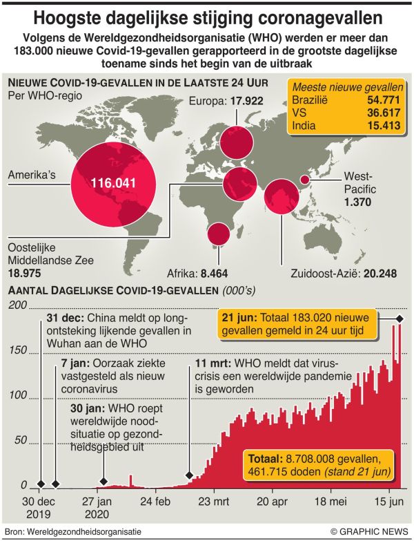 Over het geheel genomen in de pandemie, meldde de WHO 8.708.008 gevallen – 183.020 in de laatste 24 uur – met 461.715 sterfgevallen wereldwijd, en een dagelijkse toename van 4.743.