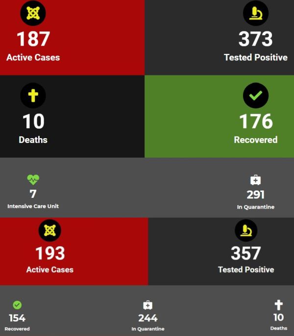 Er zijn nu 373 in plaats van 357 positef geteste cases (dus 16 meer dan gisteren), 187 in plaats van 193 actieve cases, 176 in plaats van 154 genezen (22 meer) , 291 in plaats van 244 in quarantaine, en er zijn 7 personen op de Intensive Care.