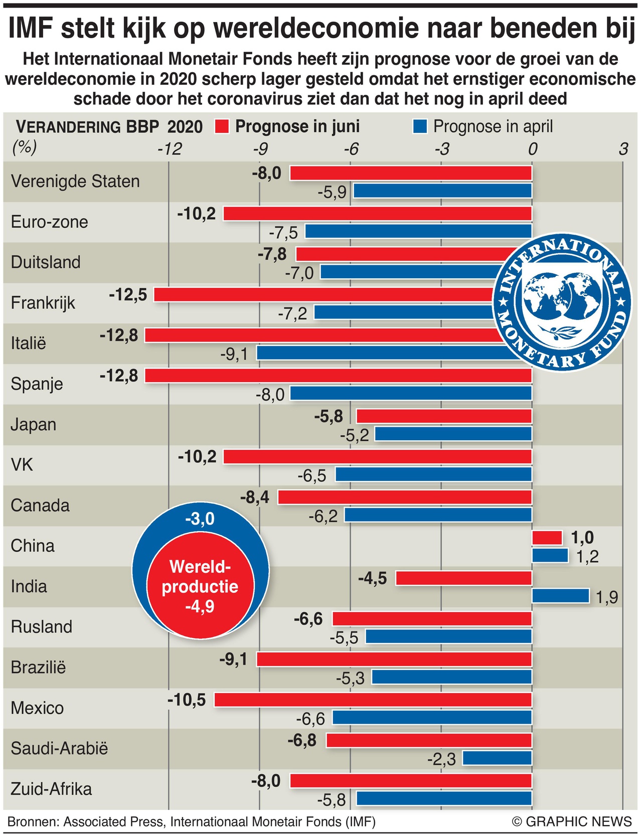 Het IMF voorspelt dat de wereldeconomie dit jaar met 4,9% zal krimpen, wat beduidend slechter is dan de 3% die het in zijn vorige rapport in april had geschat. Het IMF zegt dat de wereldwijde economische schade als gevolg van de recessie erger zal zijn dan van welke andere recessie dan ook sinds de Grote Depressie van de jaren dertig van de vorige eeuw.