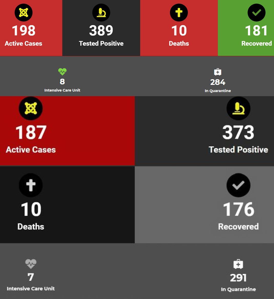 Wederom zijn vandaag 16 personen positief getest op Covid-19. Daarmee komt het aantal besmette personen nu op 389 (was 373 gisteren). Er zijn reeds 181 personen genezen verklaard (was 176) en nog 198 actieve gevallen (was 187). Op de Intensive Care zijn liggen nu 8 patiënten (was 7 gisteren). Er zijn nog 284 personen in quarantaine in plaats van 291.