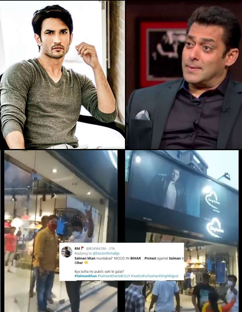 Wijlen acteur Sushant Singh Rajput is momenteel een nog grotere ster geworden. In Patna, de hoofdstad van Bihar waar Rajput werd geboren heeft men gemeend om superster Salman Khan, filmmaker Karan Johar en actrice Alia Bhatt te boycotten. Jonge Rajput-fans marcheerden in Patna naar de kledingwinkel Being Human van Salman Khan (Salman bezit een keten van merkkledingwinkels in heel India) en dwongen de manager de winkel te sluiten. Een van de demonstranten Salil Mishra, een diehard fan van Sushant Singh Rajput, zei in een clip die viraal gaat zij niets zullen toestaan van Salman Khan in Bihar. De Being Human-kleding wordt in deze staat niet verkocht. Er komt geen film met Salman Khan in Bihar uit”. De woede tegen Salman Khan vloeit voort uit een oude video die viraal is gegaan en waarin Salman tijdens zijn ondervraging over het werken met Sushant Singh Rajput tegenvragen stelde: ‘Sushant wie?’ Bihar is ondergedompeld in een staat van meedogenloos verdriet en woede over de dood van Rajput die zijn leven op 34-jarige leeftijd zelf beëindigde, naar verluidt vanwege wat bekend is geworden als de ‘nepo(tisme) bende’ ‘in Mumbai. In Bihar ziet men Salman Khan als de belichaming van alles wat mis is met Bollywood en het leven nam van Sushant Singh Rajput. Het gebeuren in Patna is op d camera en de beelden worden massaal bekeken en gedeeld op sociale media.