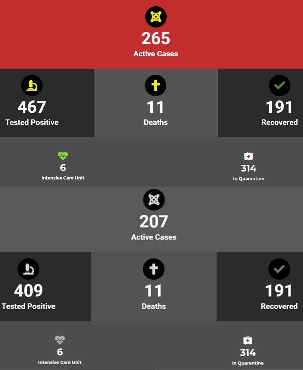 In totaal zijn er nu 265 actieve cases, wat slechts enkele uren geleden nog op 207 stond. Dat zijn er 58 meer dan eerder vanavond. Het totaal aantal positief geteste personen in Suriname staat nu op 467, wat eerder vanavond nog op 409 stond. Zes personen liggen op de intensive care.