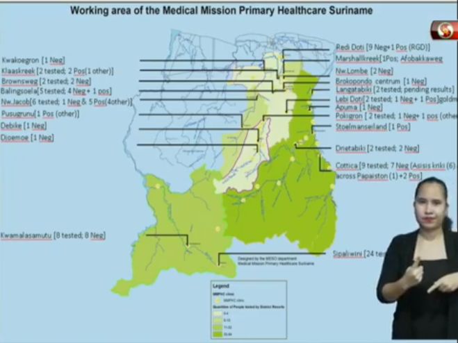 Drs Melvin Uiterloo gaf ook een presentatie namens de Medische Zending. Hij gaf een overzicht van de laatste ontwikkelingen. Zo werd duidelijk dat er missies zijn uitgevoerd in met name het zuiden en oosten van Suriname. Men ging daarbij actief op zoek naar mensen met klachten, maar er werd ook contact tracing gedaan. Bij Stoelmanseiland was er deze week een missie, waarbij circa 600 mensen werden gesproken; er werden bij hen 29 swabs gedaan. Ook was er een missie naar Antonio Brinco. Daar werden ongeveer 50 personen getest, maar de resultaten zijn nog niet bekend. In Sipaliwini moest een follow-up gedaan worden, maar vanwege de regens is dat nog niet gelukt. Er zijn wel spullen daar aangeleverd. Op dit moment is er een missie gaande te Baling Sula. Alle missies worden gedaan op basis van indicaties van bestaande casussen. Het vereist nogal wat organisatie, omdat men op die plekken alleen per boot of vliegtuig kan komen. Zo werden op verschillende plaatsen in het binnenland missies uitgevoerd, en die zijn nog gaande. De Medische Zending blijft het binnenland aandoen, ondanks de verhinderingen vanwege zware regens.