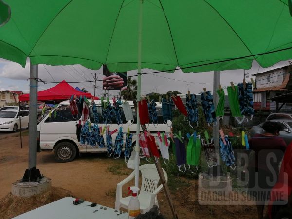 Aan de Tourtonnelaan hebben enkele standhouders hun assortiment, dat meestal bestaat uit groente en fruit, uitgebreid met mond- en neusbedekkingsontwerpen. De handgemaakte creaties moeten bescherming bieden tegen het Coronavirus. Een verkoopster zegt langs de weg deze middelen te verkopen om de verliezen die zij heeft geleden tijdens de ‘total lockdown’ enigszins in te halen. “Alle beetjes helpen”, zegt de vrouw, die ook gemberdrank en andere handgemaakte sappen verkoopt. Zij geeft aan dat er momenteel wordt gewerkt aan nieuwe modellen en andere materialen. Schuins aan de overkant van de weg is er nog een stand. Het echtpaar, dat onder een parasol heeft postgevat, vertelt dat de verkoop vrij goed gaat.