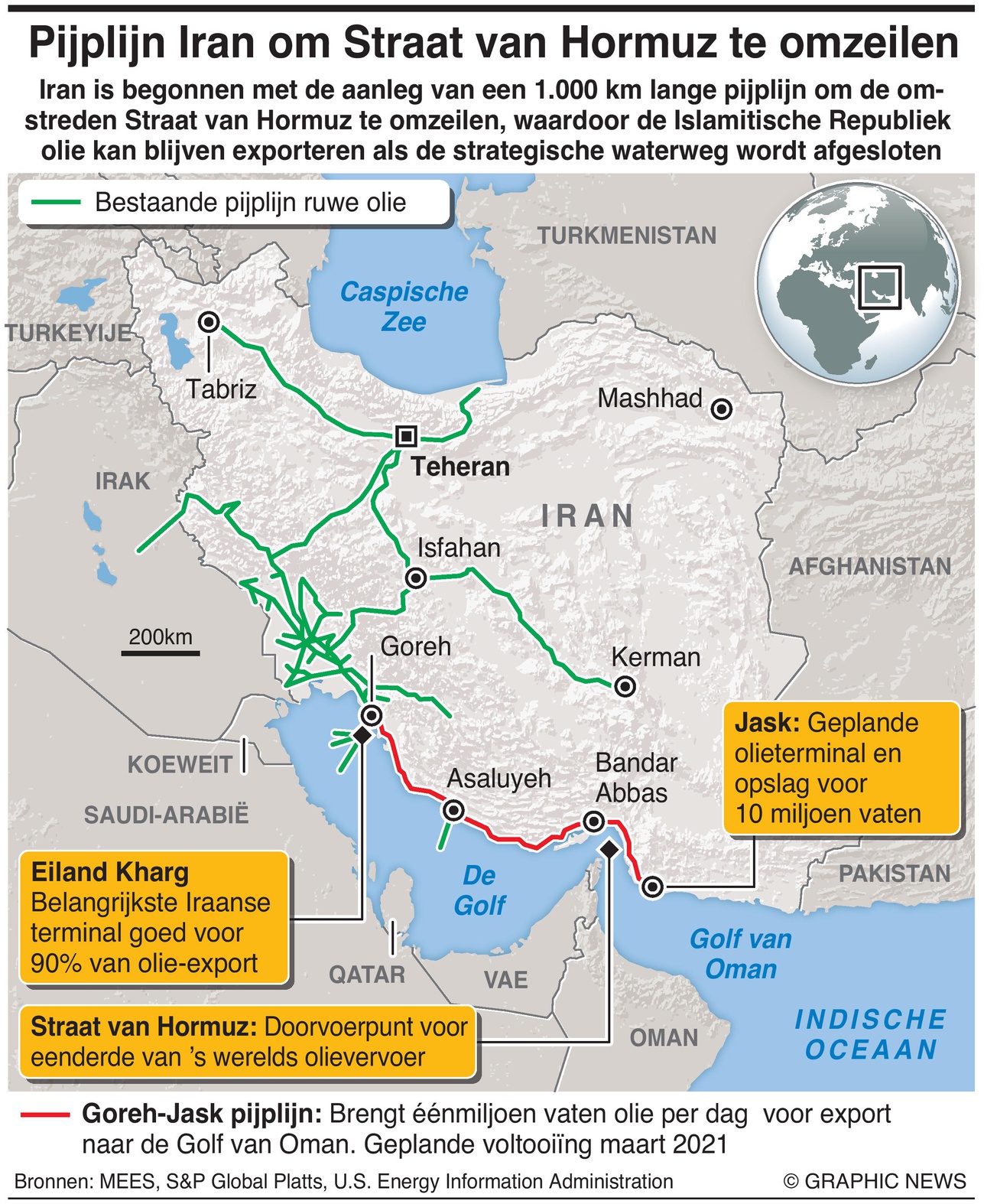 Iran is begonnen met de aanleg van een 1000 km lange pijpleiding om de omstreden Straat van Hormuz te vermijden, zodat de Islamitische Republiek olie kan blijven exporteren, ook al is de strategische waterweg gesloten.