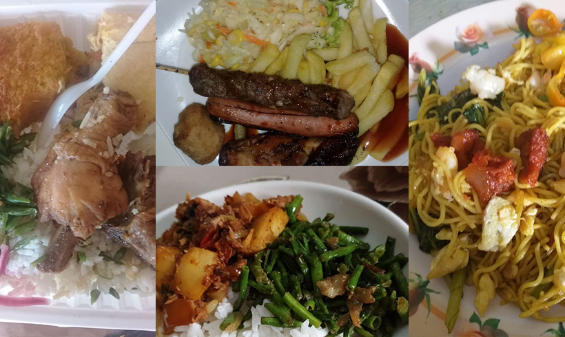 Kouseband, tuna met aardappel, Tjauwmin, pom gestoofd kip en kousenband, patat, salade, kip, sate en sausijsjes.