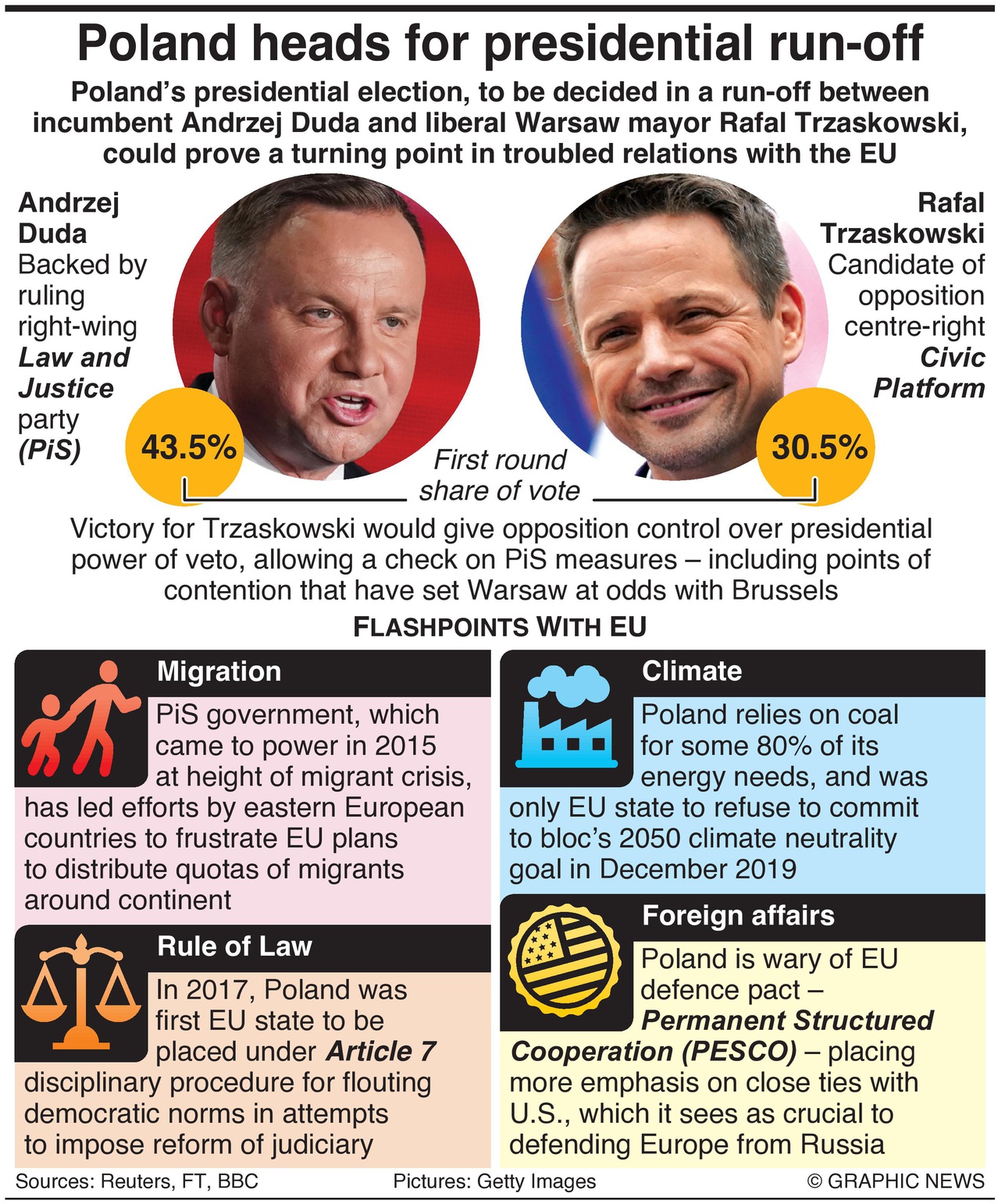 De Poolse presidentsverkiezingen, waarover moet worden beslist in een run-off tussen de zittende Andrzej Duda en de liberale Warschause burgemeester Rafal Trzaskowski, zouden een keerpunt kunnen blijken te zijn in de onrustige betrekkingen met de EU.
