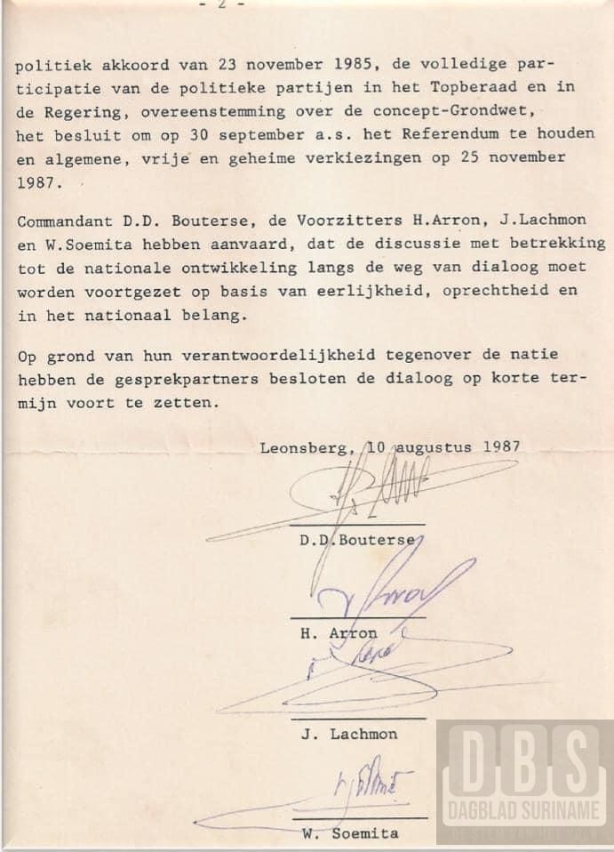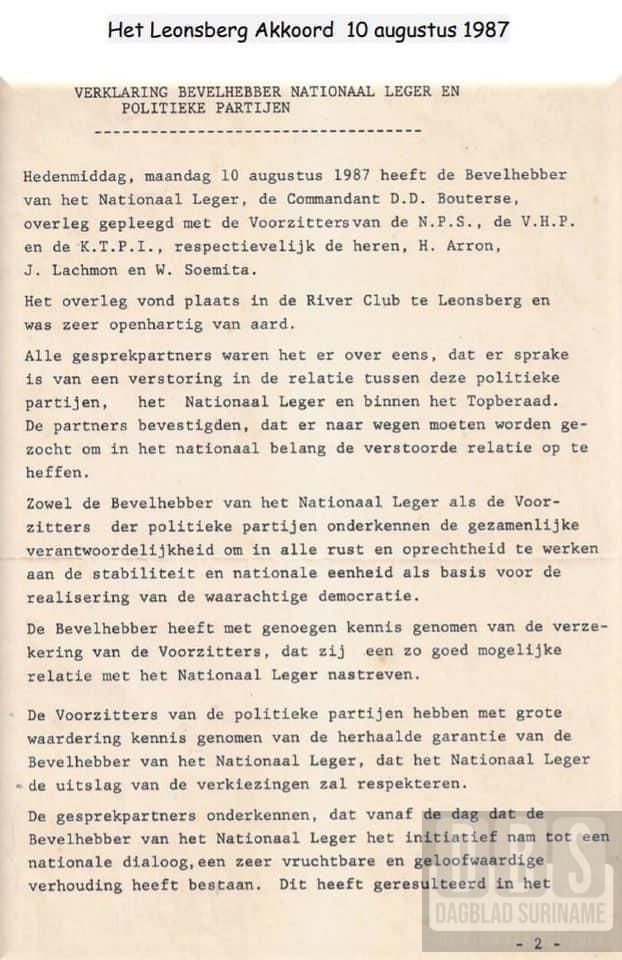 Het is duidelijk dat hier niet alleen gekeken moet worden naar wat op papier staat, maar wat tussen partijen als een ‘herenakkoord’ werd afgesproken. Over dit mondelinge gentleman agreement gaan wij nog lang door moeten raden en gokken. Feit is dat er mondeling veel meer is afgesproken en toegezegd en dat dit de reden was waarom het Leonsberg Akkoord al deze jaren buiten de publiciteit werd gehouden. En dan wordt het weer begrijpelijk waarom er geen handelingen werden gepleegd door deze politici ten nadele van Bouterse en waarom niemand durfde om de toorn van Bouterse over zich te krijgen. Was dat de eigenlijke prijs voor terugkeer van de democratie?