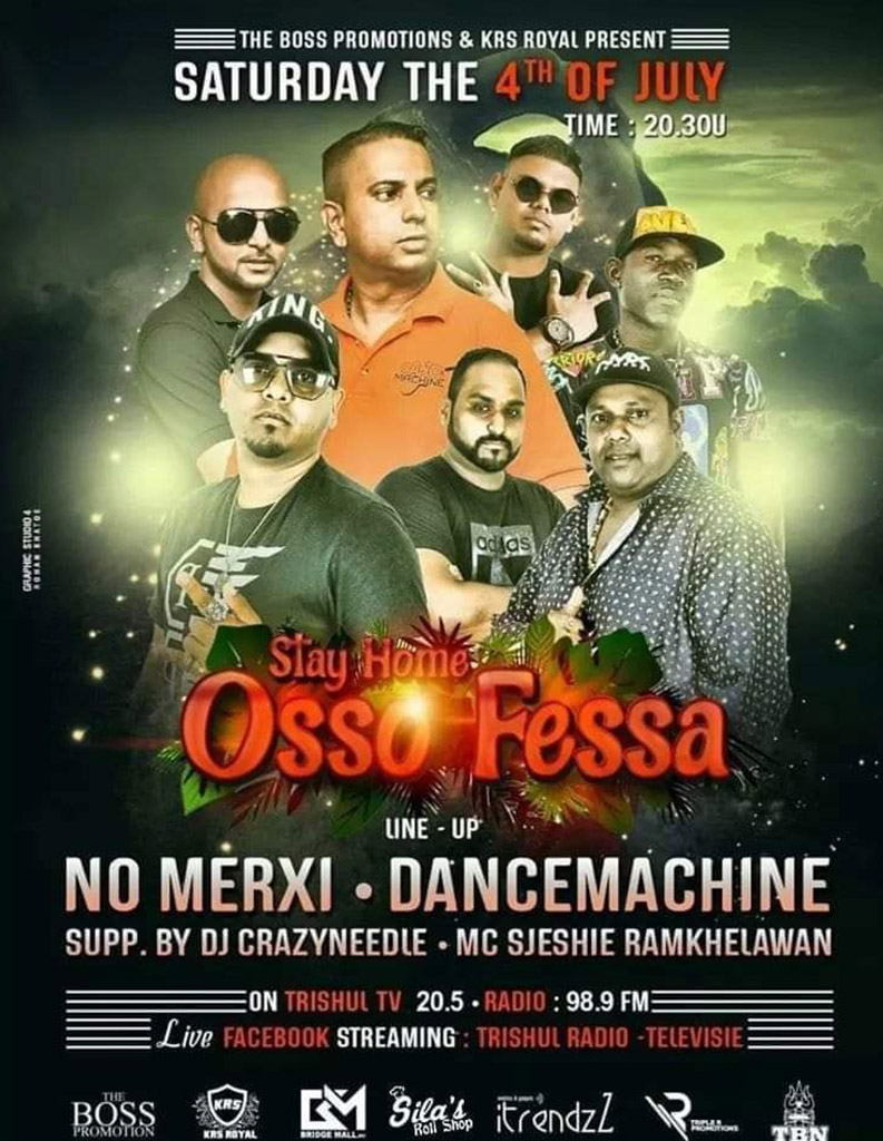 The Boss Promotions & KRS Royal hebben het initiatief genomen om een live sessie te organiseren. Zij noemen het “Stay Home Osso Fessa”. Hierbij zal het publiek vanuit een afstand toch mogen genieten van muziek door de populaire muziekgroepen Dancemachine, No Merxi en Dj Crazy Needle. Deze sessie staat gepland voor zaterdag 04 juli aanstaande. De kijkers mogen zoals de naam “Stay Home Osso Fessa” het zegt, een heel feestelijke sfeer verwachten. The Boss Promotions & KRS Royal is een organisatie die begon met kleine evenementen. De organisatie is aan het groeien en heeft slechts als doelstelling om voor volop entertainment te zorgen voor alle muziekliefhebbers.