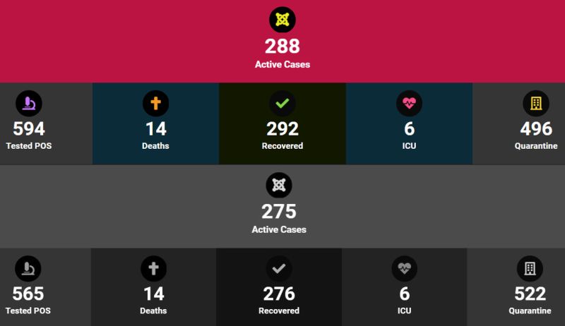 Er staan nog steeds vanaf gisteren 14 overledenen geregistreerd, 6 personen zijn ter verpleging op de IC en in quarantaine zijn er nu nog 496 personen, 26 minder dan gisteren. Vandaag werden ook de DNA leden en anderen getest. Nog niet bekend is of en welke personen uit die groep positief bevonden zijn met het virus.