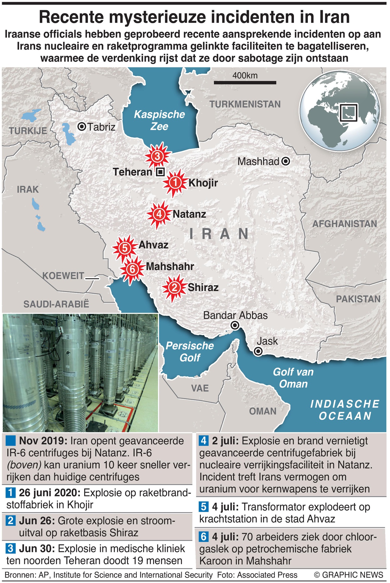 Iran bevestigde zondag dat een explosie en brand in een gebouw op de ondergrondse uraniumverrijkingslocatie van Natanz een nieuw centrifuge-assemblagecentrum was, zo meldde het door de staat gerunde Islamic Republic News Agency (IRNA). Sommige Iraanse functionarissen hebben mogelijke cybersabotage de schuld gegeven.