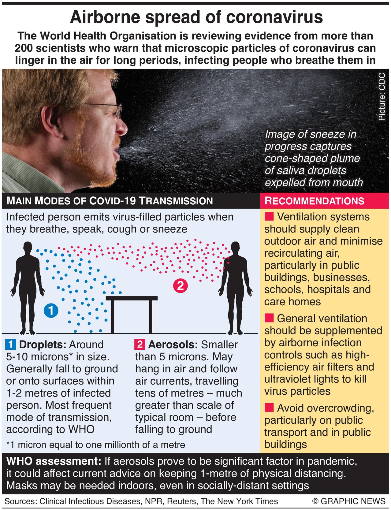 De Wereldgezondheidsorganisatie bekijkt het bewijs van meer dan 200 wetenschappers die waarschuwen dat microscopische deeltjes van het coronavirus lange tijd in de lucht kunnen hangen en zich tientallen meters kunnen verspreiden.