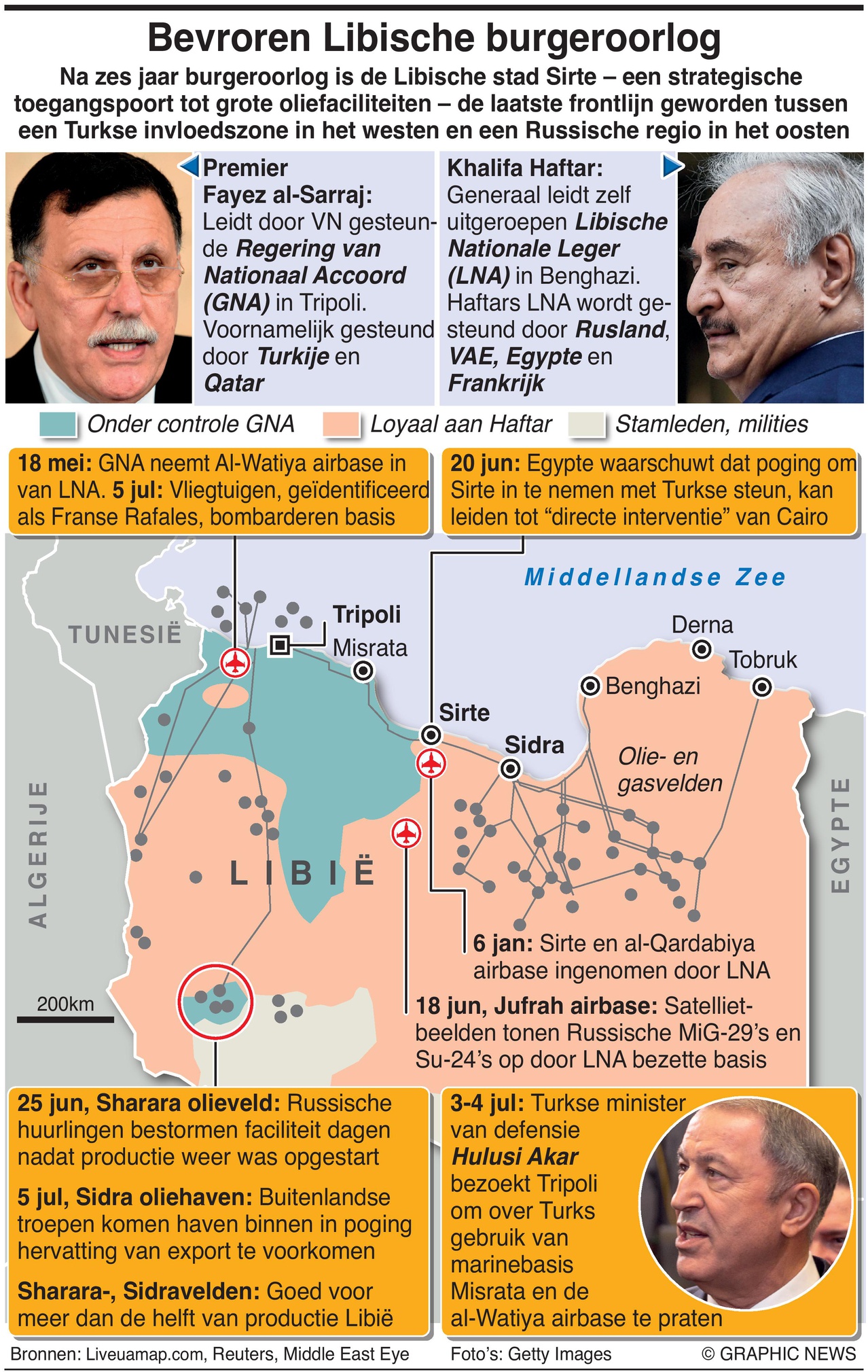 Sirte is een cruciaal conflictgebied omdat het Libische Nationale Leger (LNA) van Khalifa Haftar het gebied in het oosten controleert. De in Tripoli gevestigde, internationaal gesteunde Government of National Accord (GNA) controleert daarentegen de regio in het directe westen.