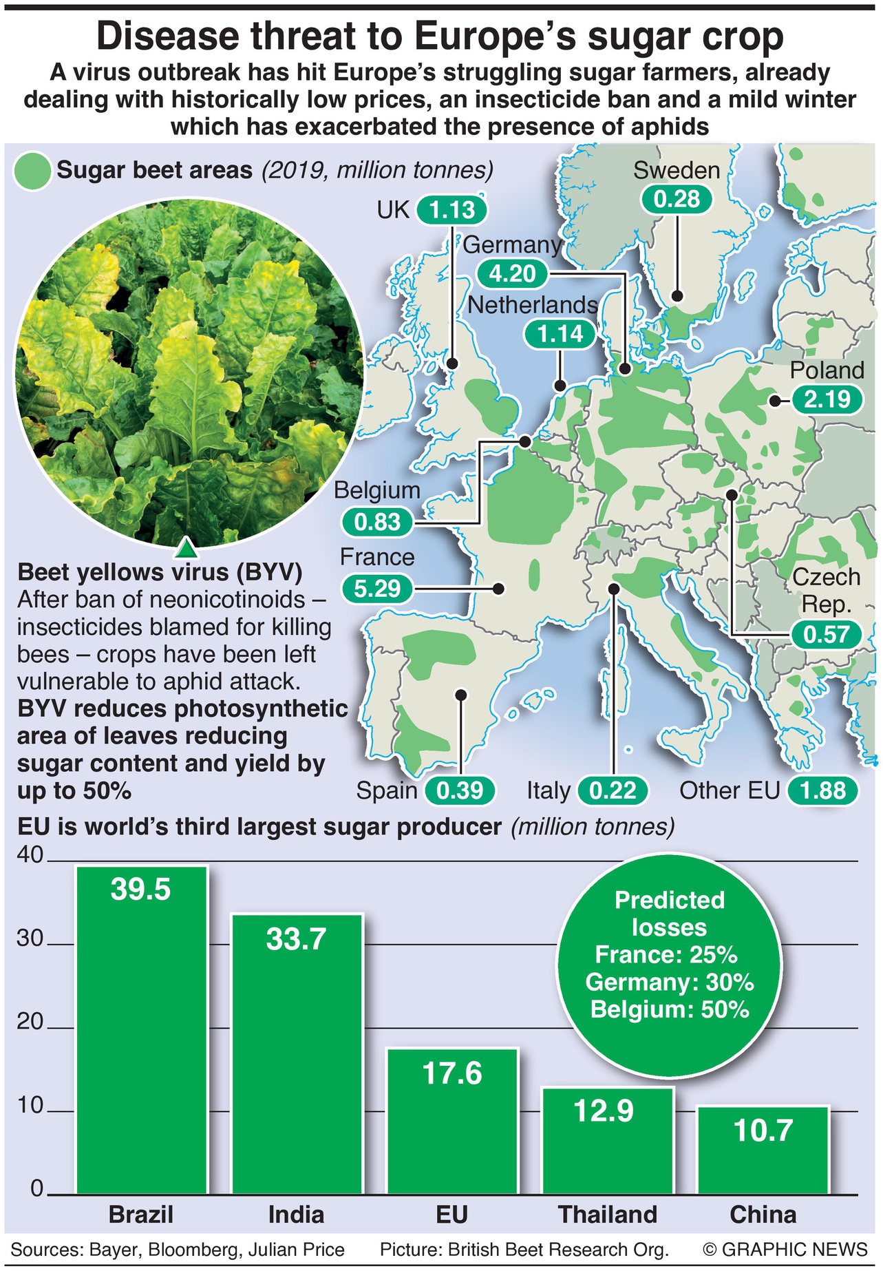Een virusuitbraak heeft de in moeilijkheden verkerende suikerboeren in Europa getroffen, die al te maken hebben met historisch lage prijzen, een verbod op insecticiden en een milde winter die de aanwezigheid van bladluizen heeft verergerd.